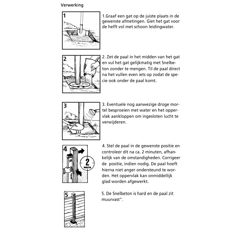 Zak snelbetonmortel 25 kg bevat ca. 13 Liter natte specie. Deze beton mortel kun je gebruiken bij het plaatsen van je poort of hekwerk. Je kan de beton mortel zo in het gegraven gat gooien en er vervolgens water bij doen. De droogtijd van het beton is 15 minuten.
