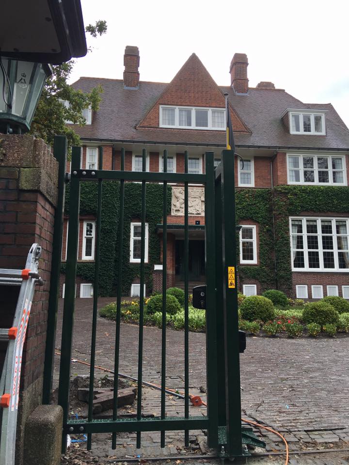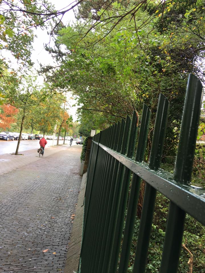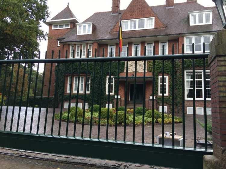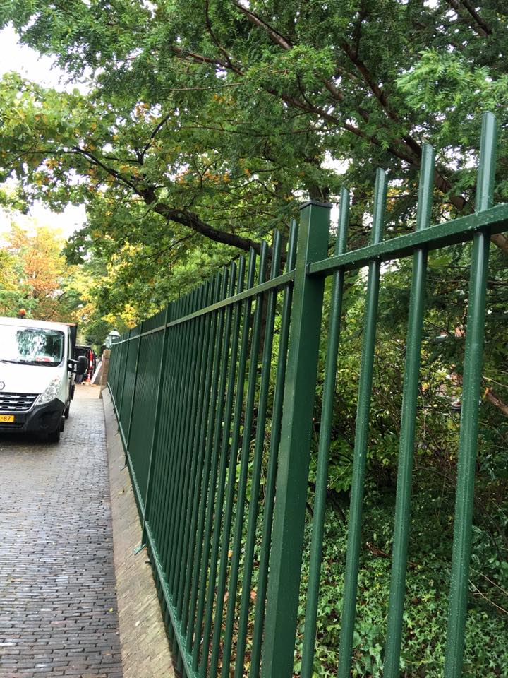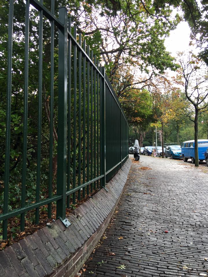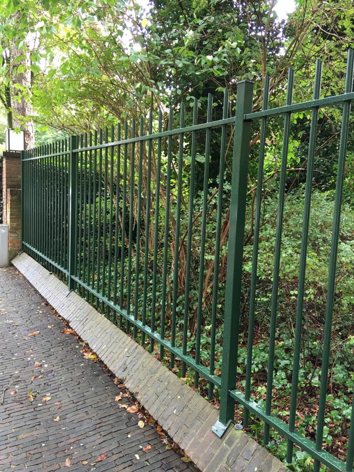 Hekwerk geplaatst bij ambassade van België te den haag mooi project schuifpoort met looppoort en aansluitend 180 mtr spijlen hekwerk gemonteerd op muur.